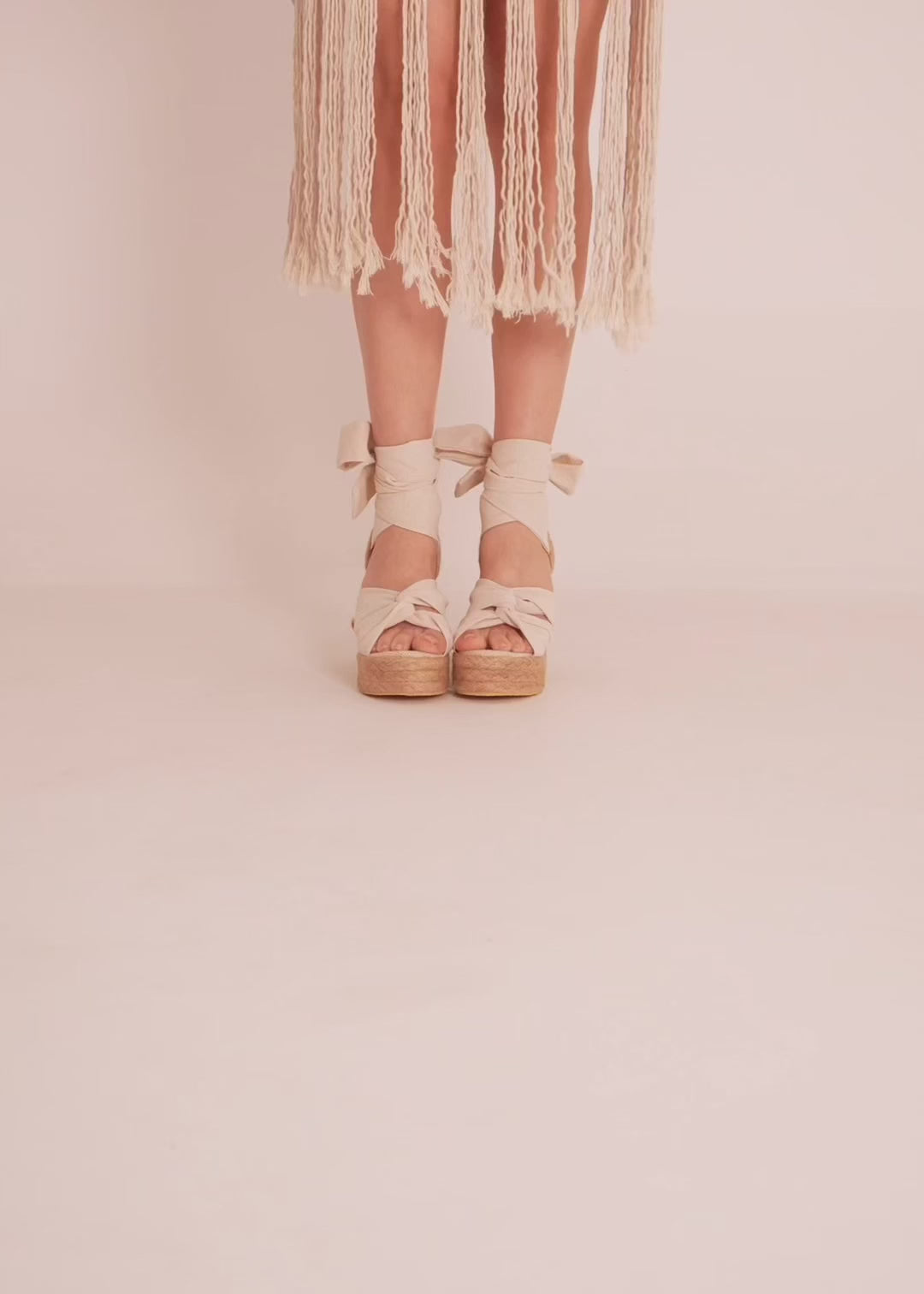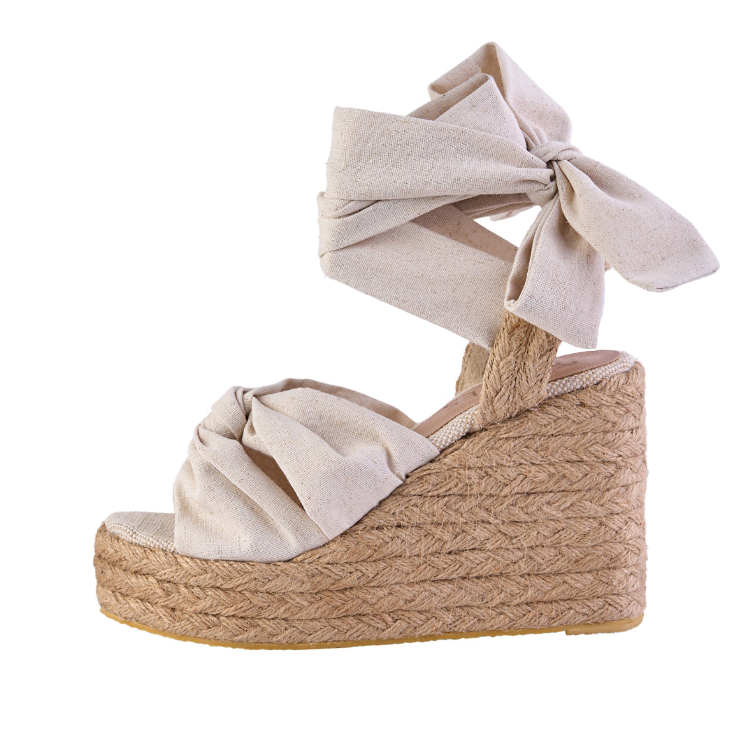 These platforms are a tribute to tradition woven with dedication. Their upper is made of natural sand-colored linen. The jute sole adds a natural touch for walking with roots and style.